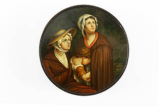 Runde Dose mit zwei jungen Frauen mit Strohhut bzw. Rüschenhaube und kleinem, sich die Augen zuhaltendem Kind bei der Schutzsuche vor dem Gewitter unter einem Baum. Im Hintergrund Landschaft mit Haus und zuckendem Blitz. Malerei nach einer Vorlage von Edward Bird (1772-1819).