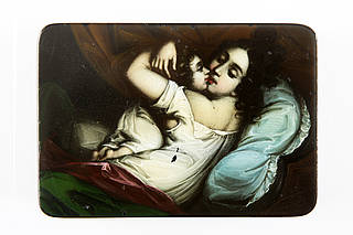 Rechteckige Dose mit junger Mutter im Nachtgewand, die ihr Kind aus den Kissen hebt, umarmt und küsst.