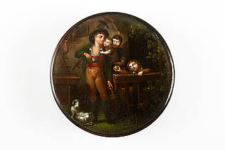 Runde Dose mit einer Familienidylle vor bescheidener Bauernkate. Der junge Familienvater mit Sense, Rechen und Korb wird von seiner Frau, seinen beiden Kindern und dem Hund am Gartentor verabschiedet. Im Hintergrund Hühner und Hahn. Malerei nach einem Kupferstich von Joseph Kovátsch (1799-1839) nach einer Vorlage von Johann Heinrich Ramberg (1763-1840).