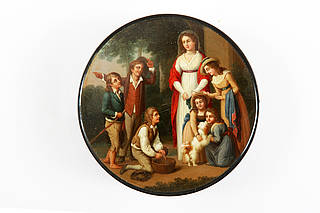 Runde Dose mit vornehmer Dame mit Kinderfrau und zwei kleinen Töchtern, die im Freien einen kleinen Hund begrüßen, den ihnen drei Bauernburschen im Körbchen zuführten.