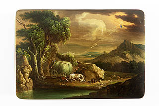 Größere, rechteckige Schnupftabaksdose mit heroischer Gewitterszene. Flußlandschaft mit Blitzeinschlag in ein mit Heu beladenes Pferdefuhrwerk neben großer Baumgruppe. Strauchelnde Pferde und vom Blitz getroffene Männer am Boden. Im Hintergrund dunkle Gewitterlandschaft.