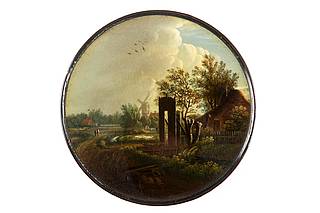 Runde Dose mit norddeutscher Moorlandschaft. Im Vordergrund Fluß mit Wehr und Bauernkate. Im Hintergrund zwei Personen am Weg, weitere Bauernhäuser und Windmühle. Im Wolkenhimmel Vogelschwarm.