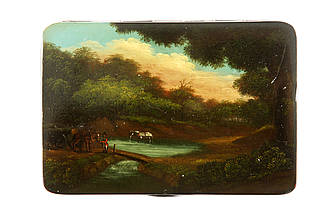 Rechteckige Dose mit düsterer Flußlandschaft mit Pferdekarren und einem ein Pferd fütternden Reitersmann. Wasserstelle mit trinkendem Pferd. Im Vordergrund kleiner Wasserfall.