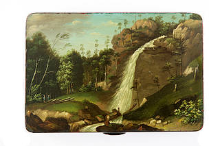 Rechteckige Dose mit einer Wald- und Felsenlandschaft mit Wasserfall und Personenstaffage.