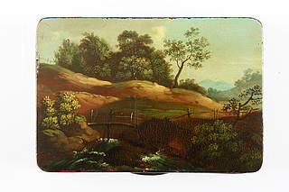 Rechteckige Dose mit einer Fluß- und Hügellandschaft mit Holzbrücke und Personenstaffage.