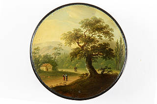 Größere, runde Dose mit einer typischen Vorharzlandschaft. Im Vordergrund bemooster Hügel mit Eichenbaum. Dahinter am Weg vier wandernde Personen. Links kleines Haus mit Fachwerk, Bäume und Büsche sowie Blick auf Berge des Harzes. Malerei im Stil des Pascha Johann Friedrich Weitsch (1723-1803).