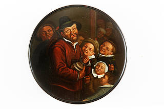 Runde Dose mit älterem Bauern mit Zahnlücke und zerbeultem Hut, der zur Belustigung seiner Zuseher, einen Murketopf (?) in den Händen hält. Malerei nach einer Vorlage von Frans Hals (ca. 1584-1666).