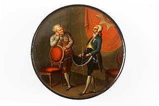 Runde Dose mit einer Szene aus Friedrich von Schillers Drama "Kabale und Liebe". Höfische Interieurszene mit einem Hofmarschall, aufgestützt auf einem Stuhl und einer weiteren hochgestellten Persönlichkeit mit Orden, Degen und Zweispitz. Malerei nach einem Kupferstich von Heinrich Schmidt (1749-1829) nach einer Vorlage von Johann Heinrich Ramberg (1763-1840).