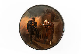 Runde Dose mit einer Szene aus Friedrich von Schillers Trauerspiel "Fiesco". Der Genueser Verschwörer Giovanni Luigi Fiesco trifft vor brennenden Mauern auf den Herrscher Andrea Doria, der ihm die letzte Haarsträhne seines Hauptes überreicht. Malerei nach einem Kupferstich von Heinrich Schmidt (1749-1829) nach einer Vorlage von Johann Heinrich Ramberg (1763-1840).