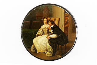 Runde Dose mit einer Theaterszene aus "Der Tartuffe" von Molière. Junge, im Sessel sitzende Frau in Barockkostüm wird von älterem Mann (Tartuffe) bedrängt. Im Hintergrund ein weiterer, durch die Tür blickender Mann mit Hut mit Straußenfedern. Blick durch ein Fenster auf eine Kirche.