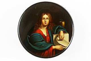 Runde Dose mit dem Heiligen Johannes (Johannes der Täufer) mit Heiligenschein, Schriftrolle, Buch und Kelch an einem Tisch. Neutraler Hintergrund. Malerei nach einer Stichvorlage von Christian Friedrich Müller (1783-1816) nach einem Gemälde von Domenico Domenichino (1581-1641).