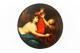 Runde Dose mit alttestamentarischer Szene. Das barbusige Weib Pothiphars bedrängt den jungen Joseph in ihrem Schlafgemach zu bleiben. Im Hintergrund geflügelte Frauengestalt. Malerei nach einer Vorlage von Carlo Cignani (1628-1719).