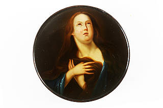 Runde Dose mit der Heiligen Magdalena mit offenem, langen Haar, Schultertuch und verschränkten Händen vor ihrer mit ihrem Haar bedeckten Brust. Neutraler Hintergrund. Malerei nach einer Vorlage von Guido Reni (1575-1642).