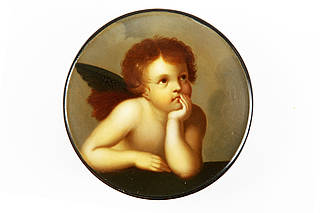 Runde Dose mit sinnierendem, unbekleideten kleinen Engel mit aufgestütztem Arm an einer Mauerbrüstung. Im Hintergrund Wolkenhimmel. Malerei nach einem Detail des Gemäldes "Die Sixtinische Madonna" von Raffaelo Santi, genannt Raffael (1483-1520).