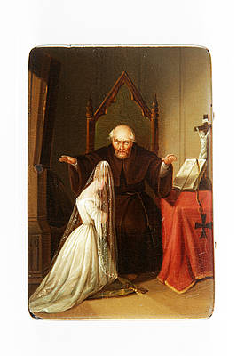 Rechteckige Dose mit einer Szene aus Shakespeares Drama "Romeo und Julia". Julia im Brautkleid bei der Entgegennahme des Segens durch Pater Laurentius vor aufgeschlagener Bibel mit Kreuz am Band sowie aufgestelltem Kruzifix .