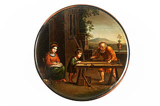 Runde Dose mit einer Darstellung aus der biblischen Geschichte. Die Heilige Familie im Freien vor einem Haus. Maria bei der Handarbeit, Joseph mit dem Jesuskind beim Schreinerhandwerk am Arbeitstisch. Im Hintergrund Balustrade mit antiker Vase, Baum und Berglandschaft.