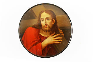 Runde Dose mit kreuztragendem Christus mit rotem Mantel. Neutraler Hintergrund. Malerei nach einer Vorlage von Annibale Carracci (1560-1609). Anmerkung: Ein beinahe identisches Dosenexemplar in der Stiftung Stadtmuseum Berlin (seitenverkehrte Darstellung).