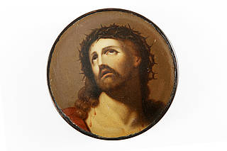 Runde Dose mit einem Bildnis des gegeißelten Christus mit Dornenkrone. Malerei nach einer Vorlage von Guido Reni (1575-1642). Anmerkung: Das Gemälde befindet sich heute in der Gemäldegalerie Dresden.