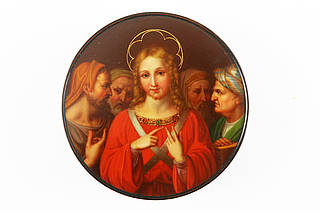 Runde Dose mit Christus mit goldenem Heiligenschein und rotem, mit Edelsteinen verzierten Mantel beim Disputieren mit vier Gelehrten. Neutraler Hintergrund. Malerei vermutlich nach einer Vorlage von Bernardino Luini, auch Lovinus (um 1483-1532).