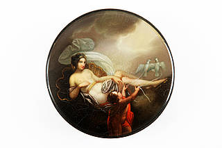 Runde Dose mit der unbekleideten Venus im Wolkenhimmel in einem Muschelwagen , der von zwei weißen Tauben gezogen und von Amor geleitet wird.
