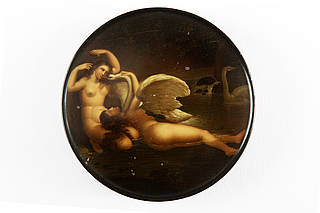 Runde Dose mit zwei unbekleideten Nymphen sowie einem sie liebkosenden Schwan beim Bad im Fluß. Im Hintergrund vor einem kleineren Wasserfall ein weiterer Schwan. Malerei nach einer Vorlage von Guillaume Lethière (1760-1832).