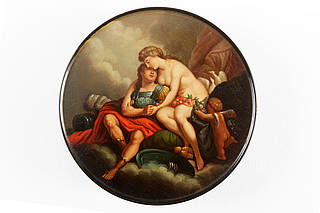 Runde Dose mit sich in den Wolken umarmenden Göttern Mars und Venus, denen vom Amorknaben ein Blumengebinde überreicht wird. Im Hintergrund zwei schnäbelnde Tauben. Malerei vermutlich nach einer Vorlage von Tiziano Vecellio, genannt Tizian (um 1477-vor 1576).
