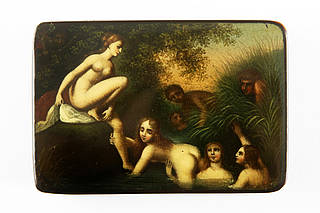 Rechteckige Dose mit fünf badenden Nymphen im Fluß, die von zwei Faunen im Schilf beobachtet werden. Malerei nach einer Vorlage von Johann Heinrich Ramberg (1763-1840)