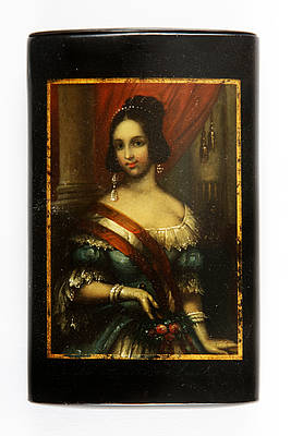 Rechteckiges Zigarrenetui. In schmaler Goldrahmung: Junge Adelige mit üppigem Perlschmuck, Festkleid mit Schärpe und Blumenstrauß in der Hand. Im Hintergrund Säule, geraffter Vorhang mit goldenen Quasten Sowie Tisch mit Blumenbouquett.
