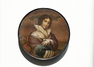 Runde Dose mit junger Frau mit Rüschenkragen, Schultertuch und Hut in der Hand vor den berühmten englischen Landungsbrücken in Brighton. Rechts die See, links ein Weg und Häuserzeile. Darüber Wolkenhimmel.