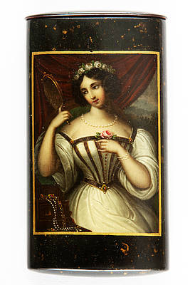 Rechteckiges Zigarrenetui. In schmaler Goldrahmung: Junge Schönheit im Festkleid mit Rosenkranz im Haar, Perlencollier, Handspiegel in der rechten Hand und einer in der linken Hand gehaltenen Rose vor ihrem Decolleté. Im Vordergrund geöffnete Schmuckschatulle, im Hintergrund geraffter Vorhang und Blick in eine Landschaft.