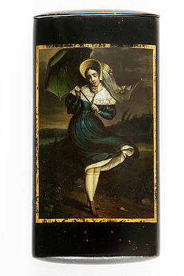 Rechteckiges Zigarrenetui. In schmaler Goldrahmung: Junge, ganzfigurige Frau mit Strohhut, wehendem Schleier, wehendem Kleid und aufgespanntem Regenschirm bei Sturm und Regen in einer Flußlandschaft.