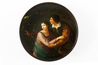 Runde Dose mit verängstigtem jungen Paar unter zuckenden Blitzen im Gewitter. Szene des Celadon mit Amelia aus der Episode "Der Sommer" aus einem Jahreszeitenzyklus. Malerei nach einer Vorlage von Angelika Kauffmann (1741-1807).