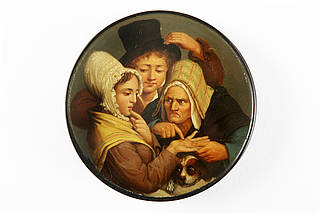 Runde Dose mit jungem Paar, einem Hund sowie alter Wahrsagerin, die der jungen Frau aus der Hand liest und ihr ein schönes Abenteuer prophezeit. Neutraler Hintergrund. Malerei nach einer Vorlage von Louis Léopold Boilly (1761-1845).