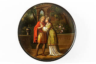 Runde Dose mit einer Szene aus dem Leben Kaiser Karls des Großen (768-814). Junges, einander zugewandtes Liebespaar im Park einer Villa. Darstellung nach einer Episode des Schriftstellers Friedrich de la Motte-Fouquet (1777-1843).