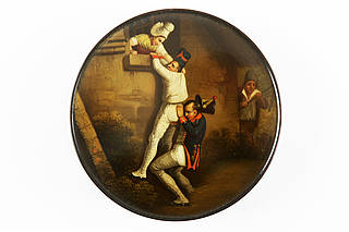 Runde Dose mit humorvoller Szene. "Schieb, schieb!" Zwei französische Sodaten in Uniform beim Einstieg ins Fenster einer jungen Frau mit Rüschenhaube. Im Hintergrund der um die Hausecke kommende Ehemann der Angebeteten mit einem Dreschflegel in Händen.