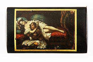 Rechteckiges Zigarrenetui mit erotischer Darstellung. In schmaler Goldrahmung: Junge Orientalin mit Turban hält ausgestreckt auf einem Divan einen mit verschränkten Beinen sitzenden, edel gekleideten Jüngling in den Armen. Die Szene belauscht von ihrem hinter dem Vorhang versteckten Herrn und Gebieter, der den Dolch gegen sie zieht.