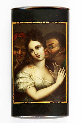 Rechteckiges Zigarrenetui, in Marmorart lackiert. In mit schmaler Goldleiste gerahmtem Rechteckfeld: Junge Schöne zwischen zwei sie bedrängenden, lasterhaften Männern, die versuchen, sie zu küssen.