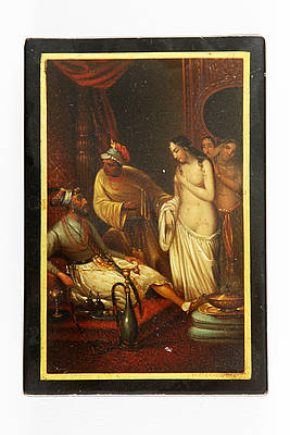 Rechteckiges Etui mit Inneneinteilung für Zigarillos. In schmaler Goldrahmung: Sklavenmarktszene im Harem. Ein Sklavenhändler preist dem Sultan, der den Preis erfragt, eine von drei Sklavinnen an. Im Vordergrund Wasserpfeife und weitere Utensilien.