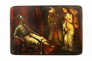 Rechteckige Dose mit einer Sklavenhandelsszene im Zelt. Ein Sklavenhändler präsentiert dem Pascha, der nach dem Preis fragt (wieviel?), drei junge Sklavinnen. Im Vordergrund: Wasserpfeife und weitere Utensilien.
