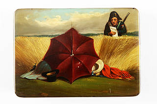 Rechteckige Dose mit erotisch-humoristischer Darstellung. Vor einem Kornfeld aufgespannter, großer Regenschirm. Um ihn herum verstreute Damen- und Herrenkleidung der Biedermeierzeit. Im Kornfeld stehender, Protokoll aufnehmender Sittenwächter mit Zweispitz und Gewehr. Wolkenhimmel.