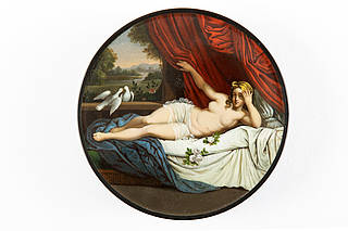 Runde Dose mit junger, auf dem Ruhelager gebetteter, nur mit Gazeschleier verhüllter Schönheit mit Turban in Erwartung vor gerafftem Vorhang. In der Fensternische ein schnäbelndes Taubenpaar; dahinter Rosen und Blick in eine weite Flußlandschaft. Malerei nach der Vorlage "Danae" von Francesco Albani ( 1578-1660), das im 19. Jh. Annibale Caracci (1560-1609) zugeschrieben wurde.