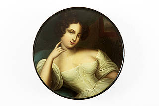 Runde Dose mit junger Schöner in Erwartung. Im Hintergrund geraffter Vorhang und Fensterausschnitt mit Blick ins Freie.