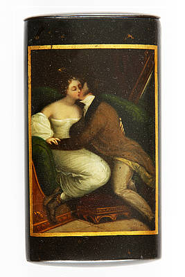 Rechteckiges Zigarrenetui. In schmaler Goldrahmung: Junges, sich küssendes und umarmendes Paar auf Bettkante und Fußbank im Boudoir.