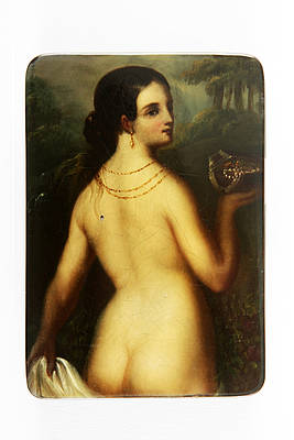 Rechteckige Dose mit junger, entkleideter Schönheit in Rückenansicht mit Tuch und Schale mit Blumen und Perlenkette in Händen. Im Hintergrund Waldlandschaft.