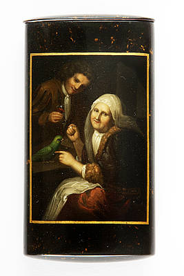 Rechteckiges Etui. In schmaler Goldrahmung: Alte Frau mit Zuckerwürfel beim Füttern eines Papageis auf dem Tisch und junger Mann mit Weinglas in einem Raum. Malerei nach einer Vorlage von Godfried Schalken (1643-1706).