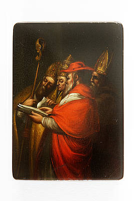 Rechteckige Dose mit einer Zusammenkunft der vier Kirchenväter. Malerei nach einer Vorlage von Peter Paul Rubens (1577-1640).