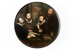 Runde Dose mit vier niederländischen Philosophen in Barockkostümen mit aufgeschlagenen und geschlossenen Büchern am Tisch. Im Hintergrund Säulen, geraffter Vorhang und Blick ins Freie. Malerei nach einer Vorlage von Peter Paul Rubens (1577-1640).