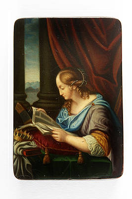 Rechteckige Dose mit der Heiligen Katharina mit Perlenkette im Haar, geöffnetem Buch und abgelegter Krone auf einem Kissen mit Quasten. Hinter ihr ein zur Seite geraffter Vorhang sowie zwei Säulen mit Durchblick in eine Landschaft. Malerei nach einer Vorlage von Carlo Dolci (1616-1686).