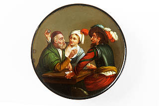 Runde Dose mit einer Falschspielerszene beim Kartenspiel. Junge Frau hält hinter älterem Mann einen kleinen Spiegel in die Höhe, auf welchem der Gegenspieler Einblick in dessen Karten bekommt. Neutraler Hintergrund. Malerei vermutlich nach Peter Paul Rubens (1577-1640).