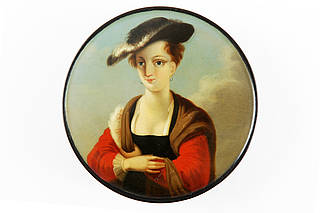 Runde Dose mit junger Frau mit Strohhut mit Federn und Perlohrringen vor Wolkenhimmel. Malerei nach einer Vorlage von Peter Paul Rubens (1577-1640). Anmerkung: Das Originalgemälde befindet sich in der English National Gallery in London.